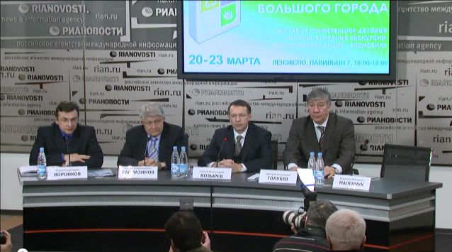 В предверии открытия Международного форума «Экология большого города» на традиционной пресс-конференци выступили: вице Губернатор Санкт-Петербурга С.А Козырев, председатель комитета по природопользованию и охране окружающей среды и обеспечении экологической безопасности Санкт-Петербурга Д.А Голубев, ген. директор гос унитарного предприятия «Водоканал» Ф.В Кармазинов, исполнительный директор ЗАО «ЭкспоФорум» С.Г Воронков. Просмотреть видео